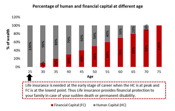 Generally, at the early stage of career, HC is at peak as the person is expected to earn for a longer time in future, while the financial capital is at the lowest point. As career progresses, people build up their FC by saving and investing part of their HC (see figure below)