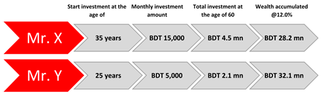 When you start investing early and for a longer period, you get the benefit of compounding. The illustration below shows how you can accumulate greater wealth by starting investing early even with a small amount.